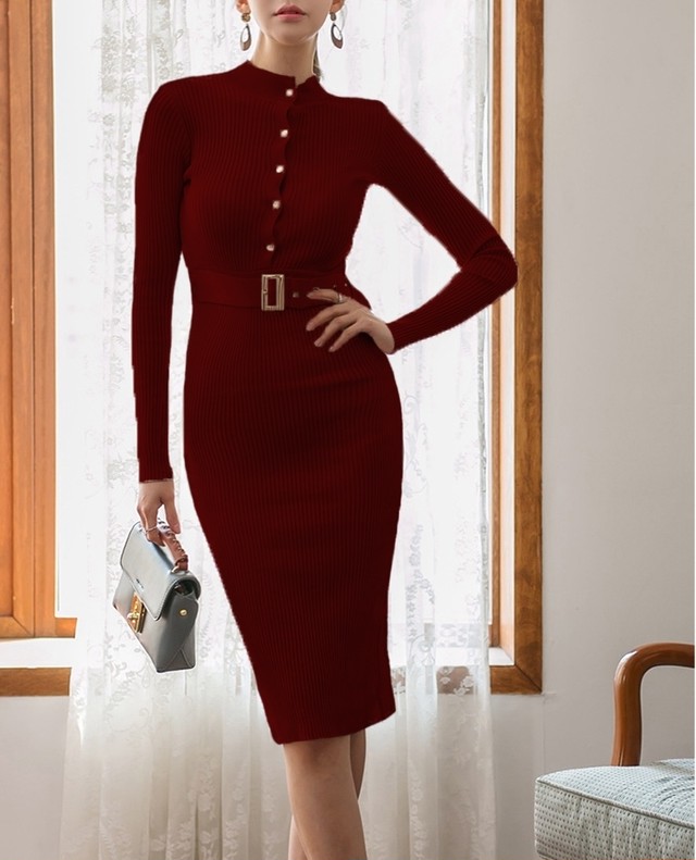 ワインレッド レディース長袖ハイネックロング ニットセクシーワンピース 新品 中古のオークション モバオク