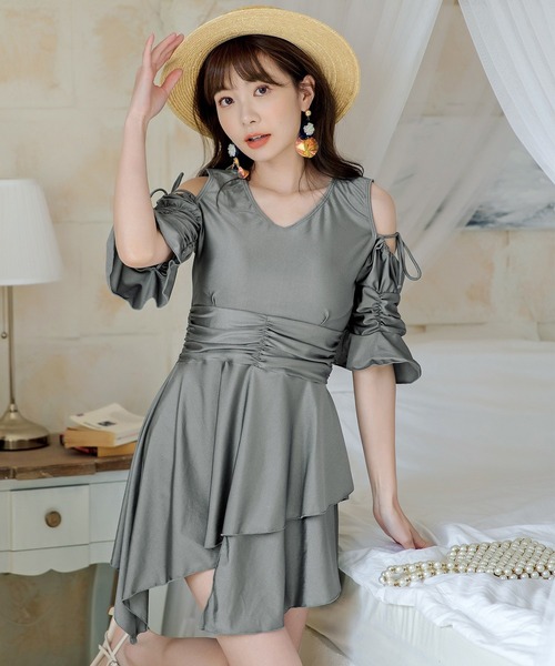 バーゲン レディース水着 オフショル風フリルリボンウエストマークワンピ ショートパンツ 2点セット 激安の Www Akronautoauction Com